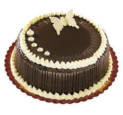 Choco Caramel Cake filled with vanilla butter creme and creamy caramel filling and iced with choco fudge frosting, topped with vanilla butter creme and decorated with a gumpaste butterfly topper. From Goldilocks.