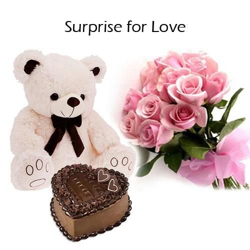 Flower Soft Teddy N Pink Rose N Heart Shape Cake. 24 inches teddy . 12 pink roses. teddy design may vary