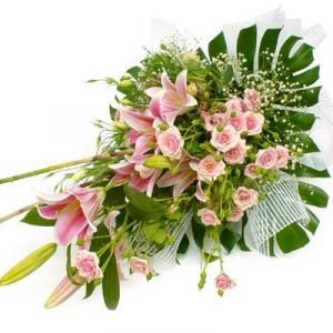 Just Smile24 Pink Mix flowers beautiful hand bouquet, decorated beautifully with lots of green fillers and ribbon. |