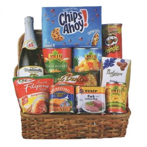 HOLIDAY BASKETChips Ahoy 266g Tropical Fruit Cocktail 850g Peach Halves 825g Martinellis Sparkling Cider 750ml Belgian Chocolate 135g Dona Elena Aldente Penne Rigate 500g Filipino Style Spaghetti Sauce 800g Hereford Corned Beef 340g Mushrooms Pieces And Stem Champignons 284g |