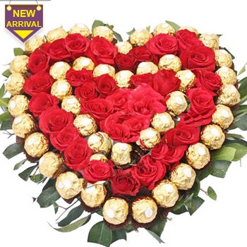 36 pomelo roses and 40 pcs ferrero rocherSend this exotice heart shape basket arrangement of 36 pomelo roses and 40 pcs ferrero rocher chocolates with green fillers. |