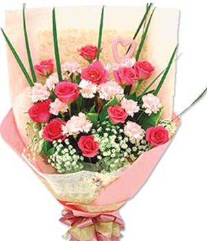 Thank You Mother11 pink carnations,11 pink red roses, match leaves and baby`s breath. Pink tissue to pack, pink ribbon to tie. Note: pink carnations may be replaced to red carnations for different area. |